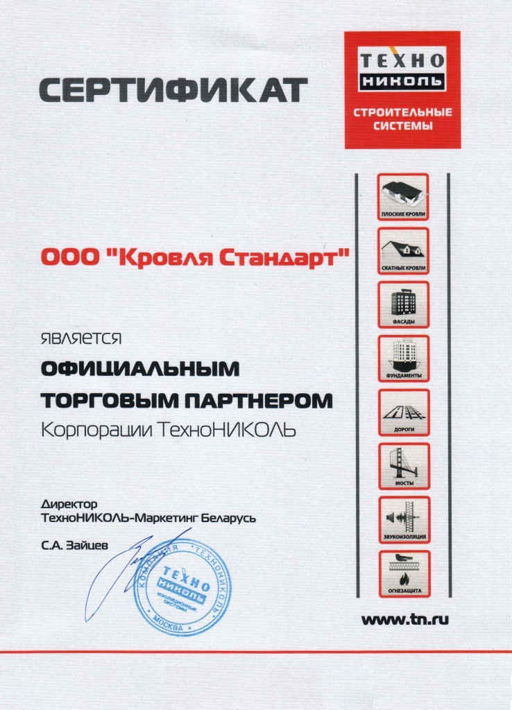 ООО “Кровля Стандарт” официальный дилер ведущих заводов-производителей России, дальнего зарубежья, официальный торговый партнёр корпорации ТехноНИКОЛЬ, официальный представитель ИООО «Кровельный завод ТехноНИКОЛЬ», г.Осиповичи Республика Беларусь, успешно работает на рынке кровельных, гидроизоляционных, рулонных и теплоизоляционных материалов. У нас Вы можете получить информацию о новых технологиях в кровельном строительстве, ознакомиться с образцами продукции и получить консультации специалистов.